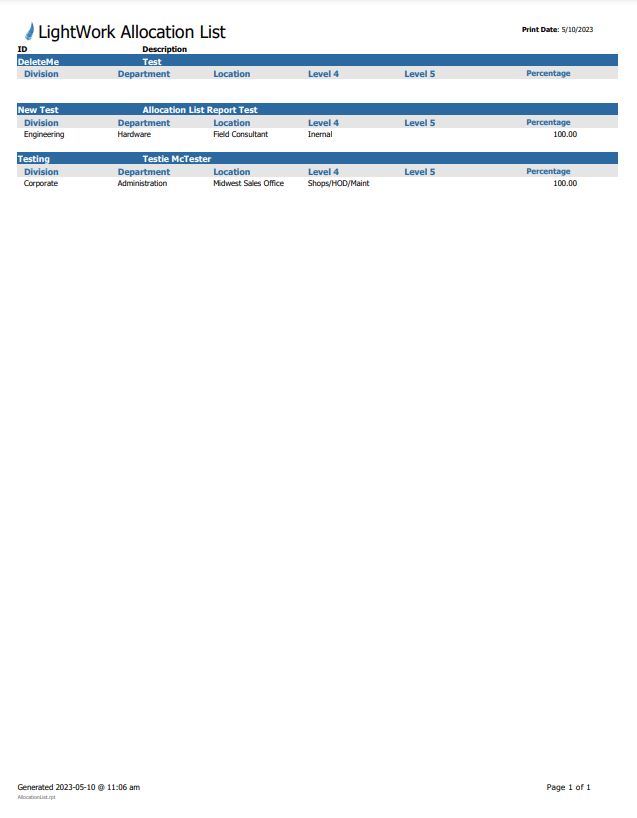 The Allocation List report provides a list of the Allocations setup in the system along with the Description and ID field values.