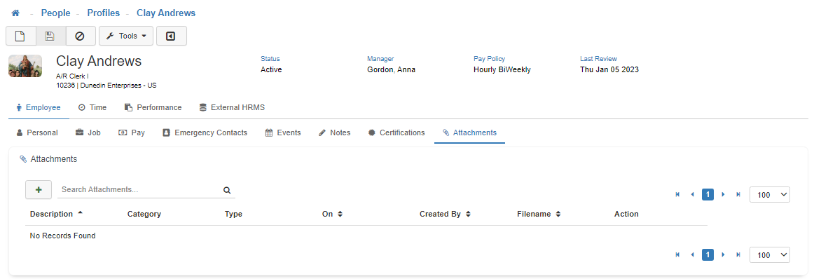 Under the Employee tab, the Attachments subtab displays an Employee's attachment(s). In this section, Users can attach important files and documents to an Employee's profile.