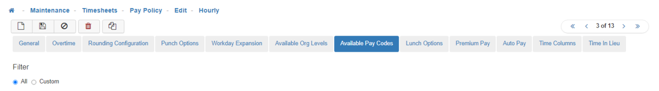 The Available Pay Codes Tab allows you to choose which Pay Codes are available for use during manual time entry, on a per Pay Policy basis, for an Employee that belongs to this Pay Policy.