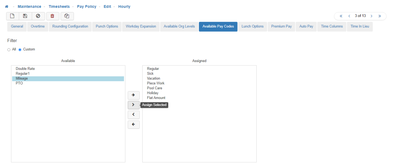 Note: To move an individual Pay Code from column to column, click to highlight the item and select the appropriate navigation arrow located in between the top and botton arrows. The top arrow will move all items from Available to Assigned, and the bottom arrow will move all items from Assigned back to Available. -