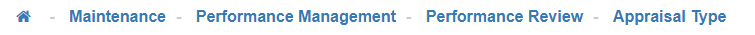 In our example above, you would currently be located in the 'Appraisal Type Maintenance'. You can click on 'Maintenance' or any of the previous stops on your 'path' to instantly be taken back from where you are.