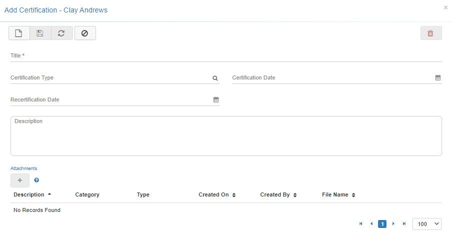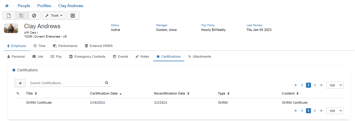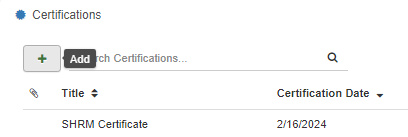 Under the Employee tab, the Certifications subtab displays an Employee's certification(s). In this section, Users can record important certification events.