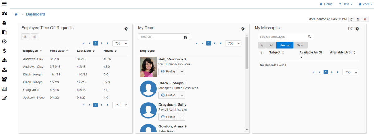 Displays the last time your Dashboard has checked for any changes to the data that is shown in the Widgets (such as Employees that have punched In or Out, Appraisal Status change, etc.). -