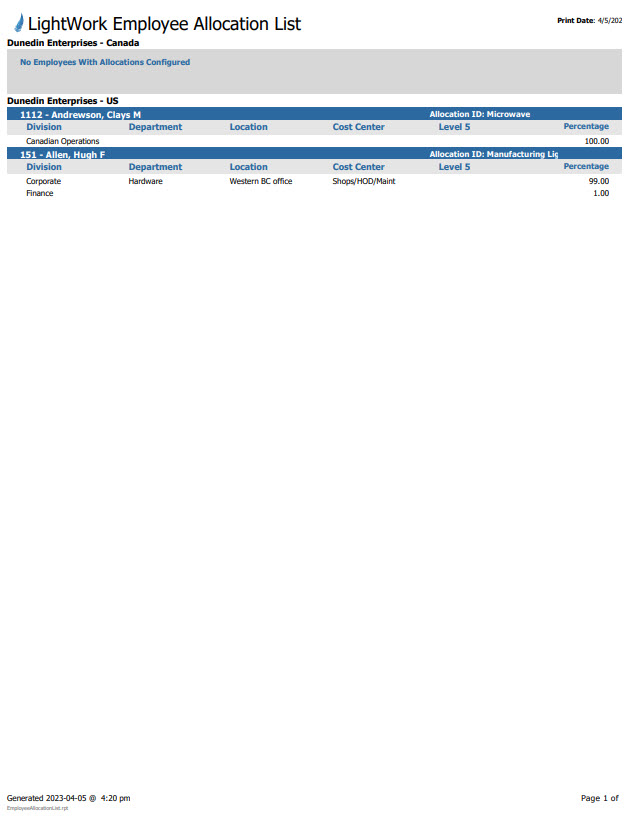 The Employee Allocation List report allows you to view all Employee allocations, grouped by company. This report can be grouped and sorted in more granular detail by your selections made within the parameter screen.