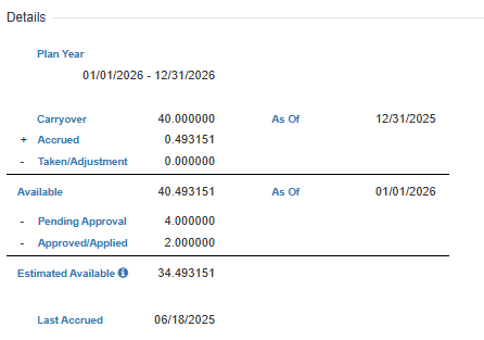 Time Available = ‘Carryover’ time + 'Accrued' time - 'Taken' time. -