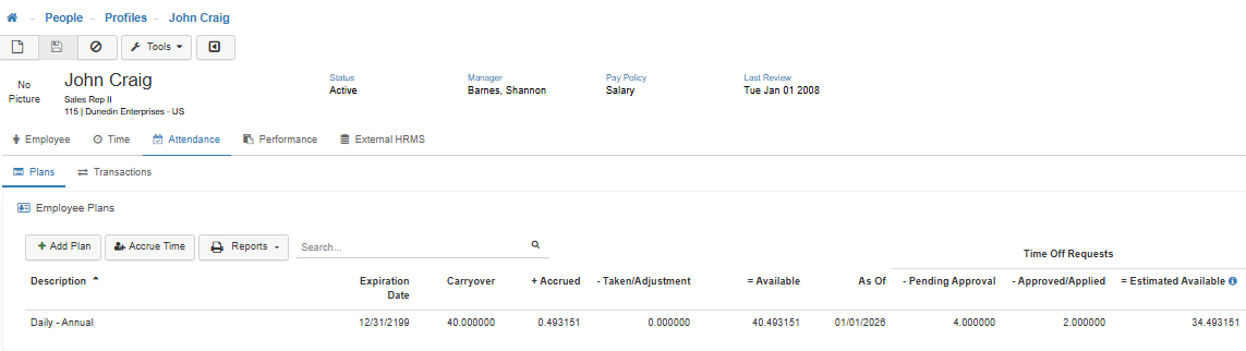 The Plans subtab allows Users access to add an Attendance Plan, Accrue Time, Reports, and Search directly from the Employee's Profile screen.
