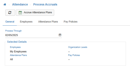 The General tab allows for the selection of the Process Through date. The General tab also displays the Selected Details summary section which displays what has been selected on each of the tabs (General, Employees, Attendance Plans, and Pay Policies). -