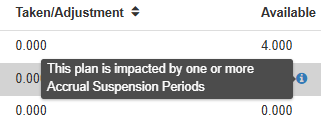 Note: If a plan is impacted by one or more Accrual Suspension periods an icon will display to the right of the Available column in the Employee Profile with the below pictured tooltip.