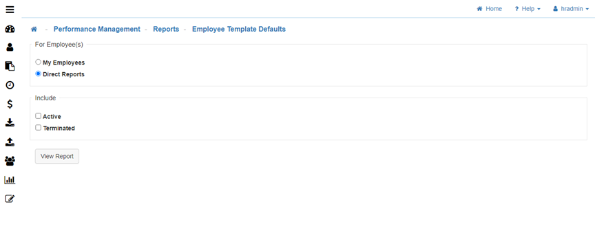 Note: To enable access to the Employee Template Defaults report, set the securable Performance Management - Detail Access - Report: Employee Template Defaults to Full Access in the Group Security Maintenance.