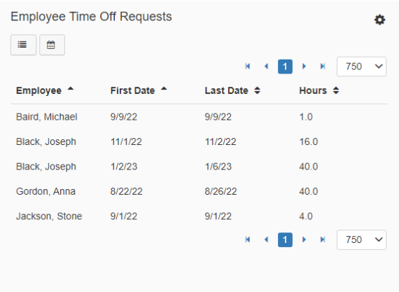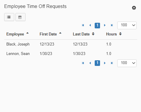 The Employee Time Off Requests Widget shows a list of all pending Time Off Requests for your Employees.