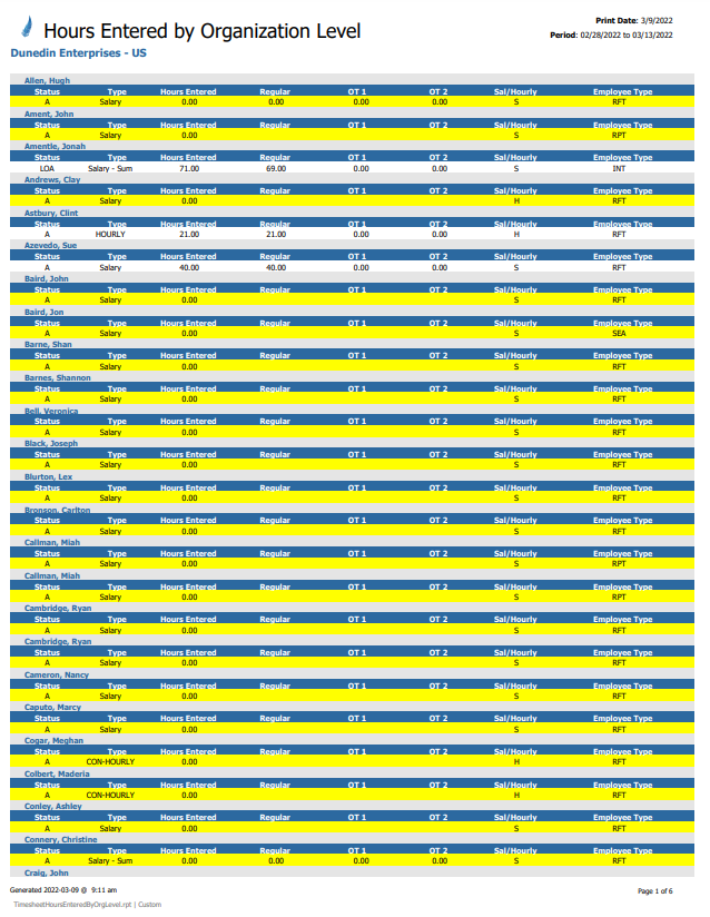 The Hours Entered By Organization Level report allows you to filter hours entered on Timesheets by Organization Level selections. Highlighted Employees do not have any hours entered for the Pay Period selected.