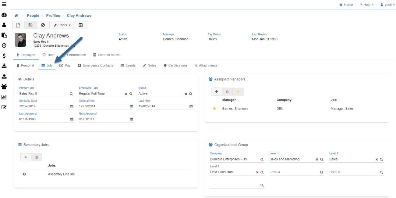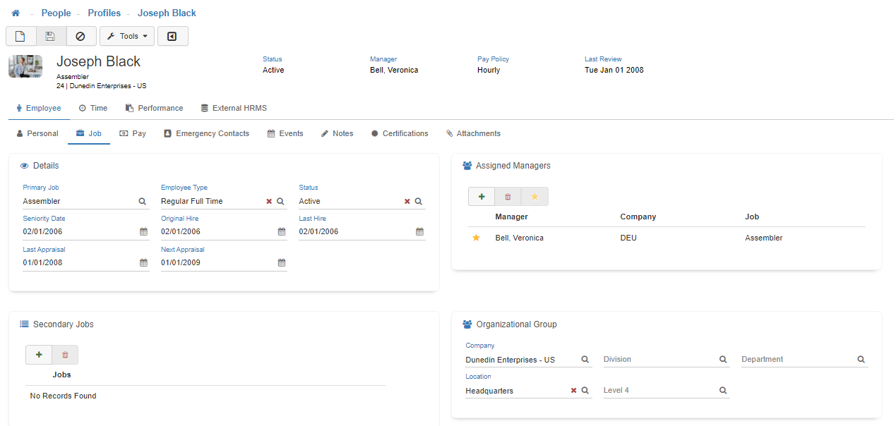 Under the Employee tab, the Job subtab displays an Employee's Job information. This includes: Assigned Managers, Primary and Secondary Jobs, and Organizational Group information.
