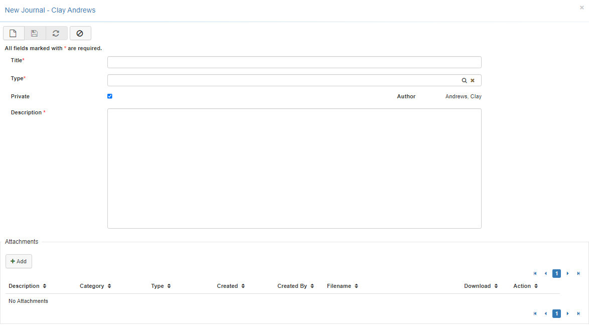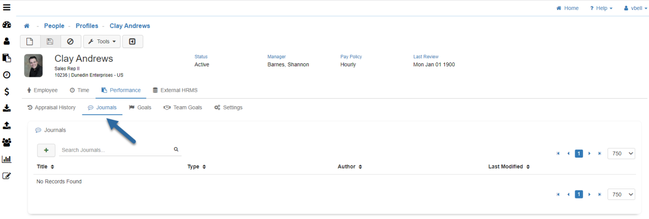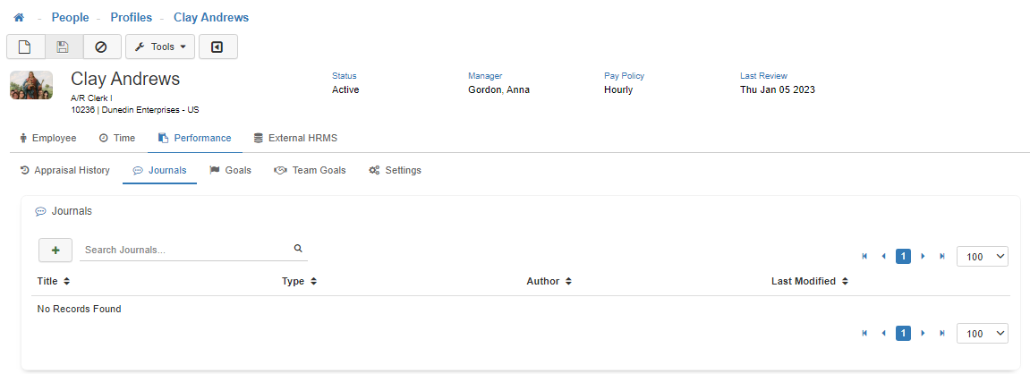 The Journals tab allows you to view all the Journals associated with the selected Employee's profile. You can also add new Journal entries.