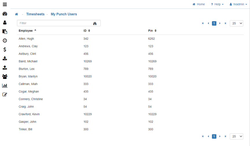 The List My Punch Users screen shows a list of all your Employees who are 'Punch Users', giving you quick access to their Punch ID and Pin.