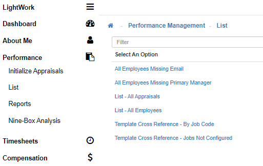 The List options allow you to quickly take inventory of an Employee's missing key information, review a list of all Appraisals, all Employees, and much more.