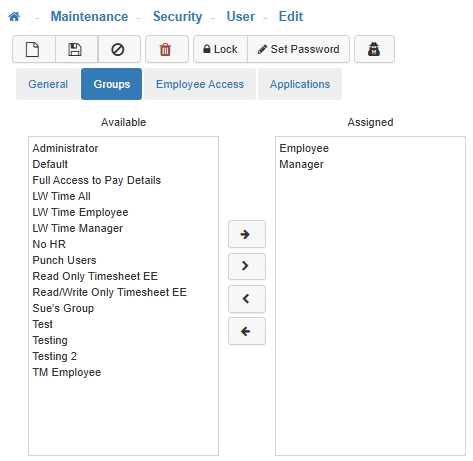 From within the User Security Maintenance, access the Groups tab to see the assigned Group Security Roles for the User. The User displayed below has both the Manager and Employee groups assigned to them.