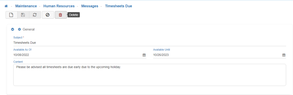 This Maintenance is controlled through Group Security by the ‘Employee Messages Maintenance’ securable. The associated ‘My Messages Widget’ and ‘My Messages’ About Me screen are controlled by securables respective to their names and type.