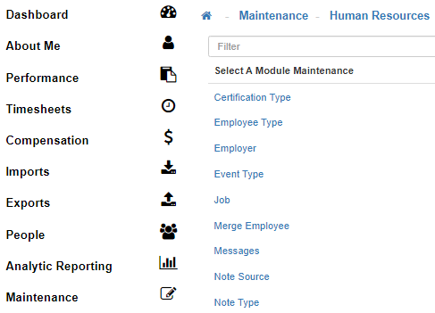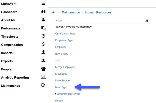 Note: This is part of the Extended Suite of People Management. If you see the Note Type Maintenance available for selection under the Human Resources Maintenance, you have been granted at least some visibility through Security Access for this Maintenance.