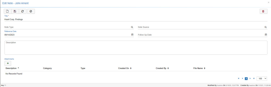 Once this field is selected, you will see the values configured within the previously described maintenance available for assignment in the 'Note Type' lookup tool.