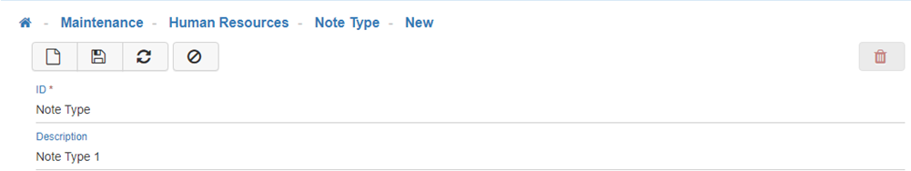The Note Type Maintenance allows you to configure the note type values available for selection in the 'Notes' card located within an Employee's profile in 'People'.