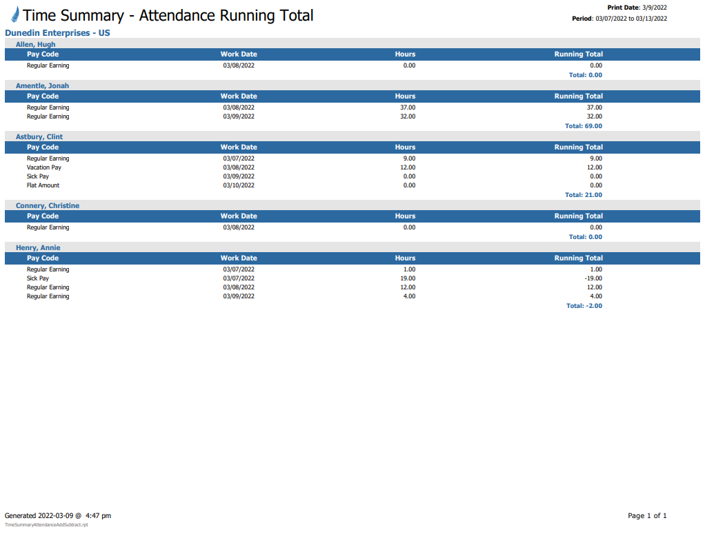 The Pay Code Running Total For Date Range report allows you to view Employee(s) Attendance Transactions by Pay Code with running totals.