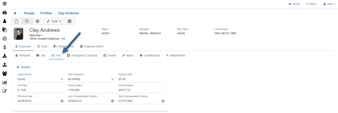 Under the Employee tab, the Pay subtab displays the following information: Salary/Hourly, Pay Frequency, Normal Units, Unit Rate, Period Salary, Annual Salary, Effective Date, Last Compensation Review, and Next Compensation Review.