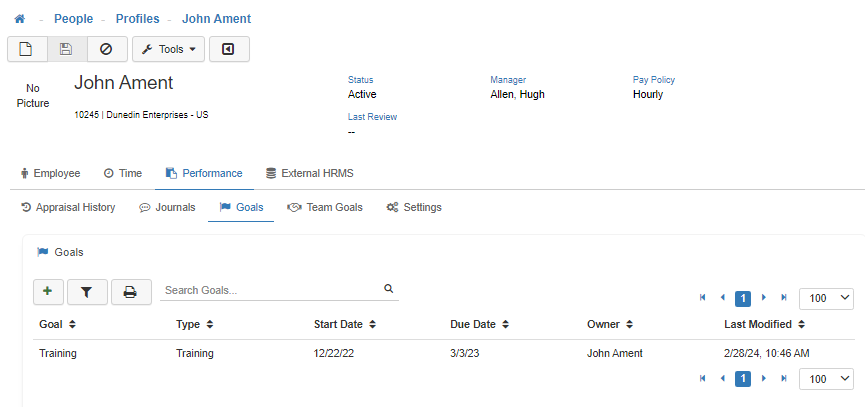 From an Employee’s Profile, select the Performance tab and then the Goals subtab.