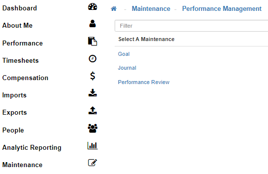 The Performance Management Maintenance provides access to the Goal, Journal, and Performance Review Maintenances where can you configure Goal, Journal, and Performance Review settings.