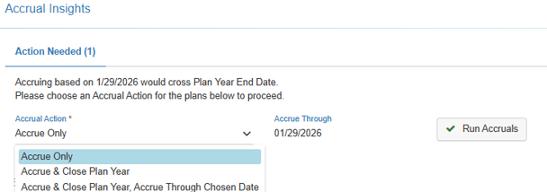 Selecting the Accrual Action 'Accrue Only' will update the plan details with calculated year-to-date time accrued through the end of the accrual year without closing the current Plan Year.