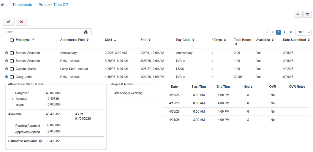 If a request is highlighted in Red this indicates to the reviewer that based on the amount of available time (since the last import) the Employee doesn’t have enough time to cover requested time off.