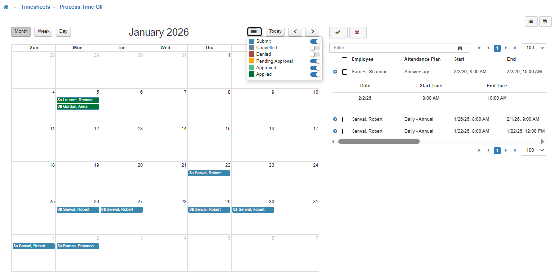 After requests have been approved, they will be applied to the Employee’s Timesheet according to how it’s configured (e.g. Auto Apply, if enabled).