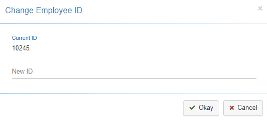 Selecting the ‘Change Employee ID’ option, provides a pop-up that allows you to assign an Employee a New ID (as well as reviewing the Current ID). -