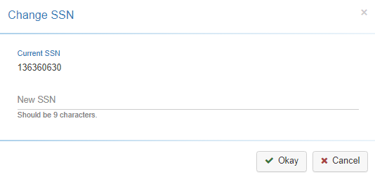 Selecting the ‘Change SSN’ option, provides a pop-up that allows you to assign an Social Security Number (as well as reviewing the Social Security Number). This option is tied to the ‘Profiles - Full SSN/SIN’ securable. If this securable is set to ‘No Access’ the Change SSN option will not display under the Tools drop-down. -