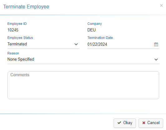 Selecting the ‘Terminate Employee’ option, provides a pop-up that allows you enter in Termination-related information such as Status, Termination Date, Reason and Comments. -