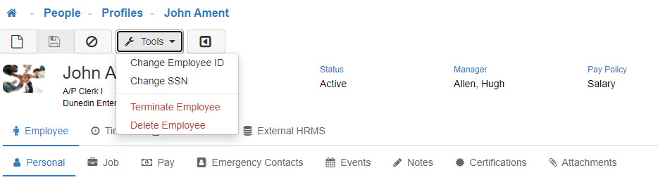 The Tools drop-down menu within an Employee's profile provides Administrative Users with tools to manage an Employee’s data.