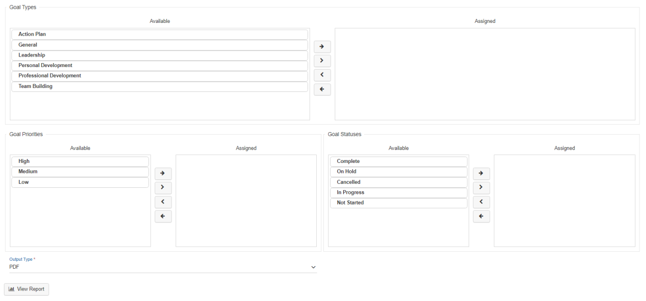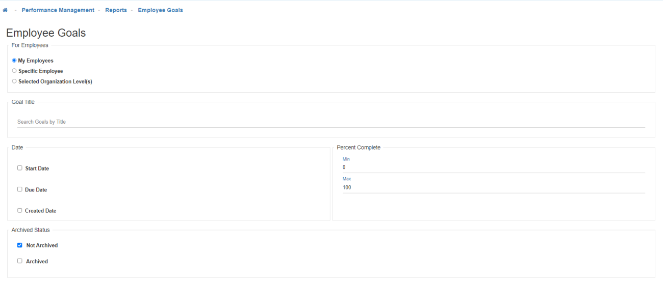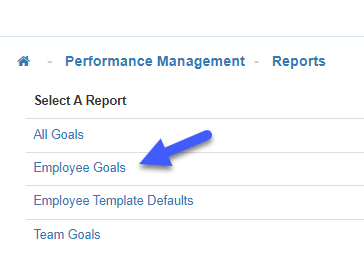 Note: To enable access to the Employee Goals report, set the securable Performance Management - Detail Access - Report: Employee Goals to Full Access in the Group Security Maintenance.
