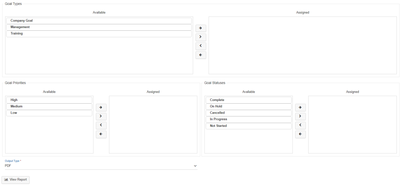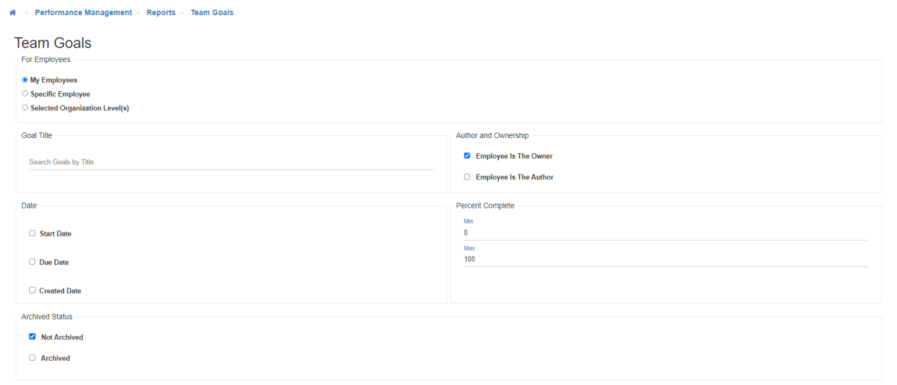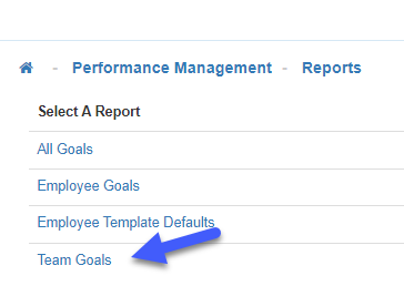 Note: To enable access to the Team Goals report, set the securable Performance Management - Detail Access - Report: Team Goals to Full Access in the Group Security Maintenance.