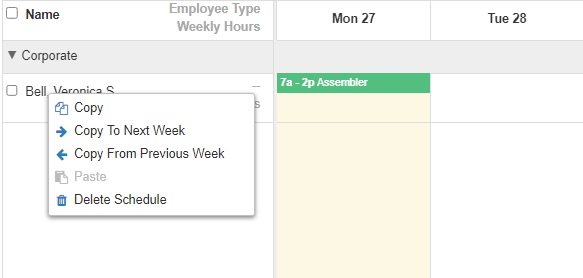 When right-clicking on an Employee's name inside the schedule, you will be provided with a list of shortcut tools you can utilize for quick access to tools such as Copy, Copy To Next Week, Copy From Previous Week, Paste, and Delete Schedule.