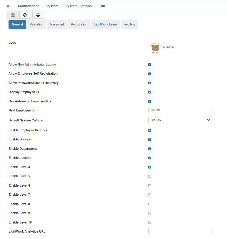 The General tab allows you to configure General system settings throughout LightWork to include logo images, self-registration, non-administrator logins, password recovery, and many more.