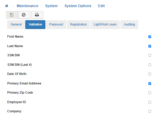 The Validation tab dictates which fields Employee(s) are required to complete when they register as a first time User, reset their password, create a new password, or acknowledge a Performance Review with an electronic signature.