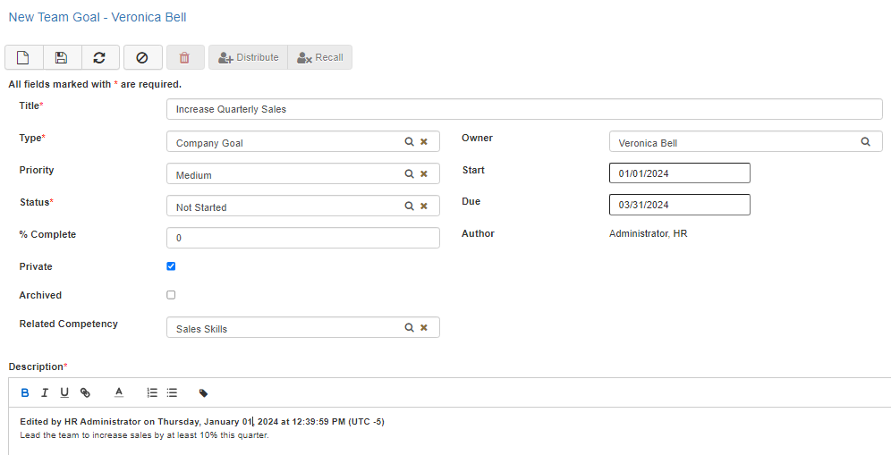 Note: Required fields can vary depending on system configuration in the Goal Maintenance. -