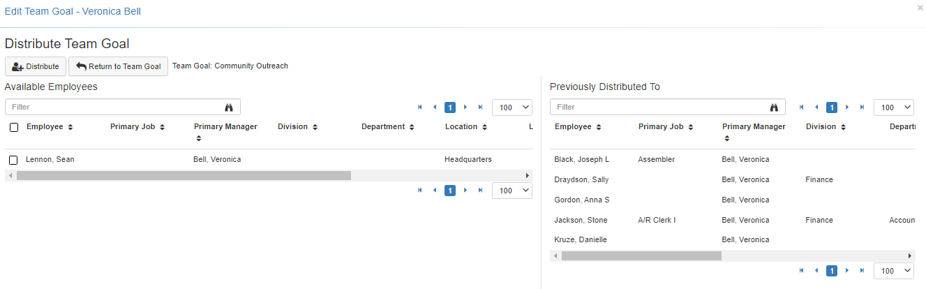 Once the Team Goal distribution has been confirmed LightWork will move the selected Employees to the 'Previously Distributed To' section. -
