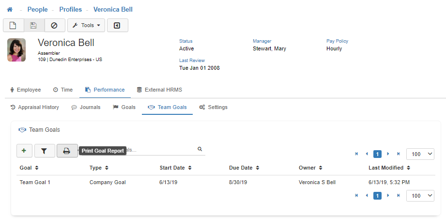 Note: To access the 'Print Team Goal Report' button set the securable Performance Management - Detail Access - Report: Team Goals to Full Access in the Group Security Maintenance. Once this is enabled, it will provide the ‘Print Goal Report’ functionality in the 'Team Goals' section of the selected Employee's profile.