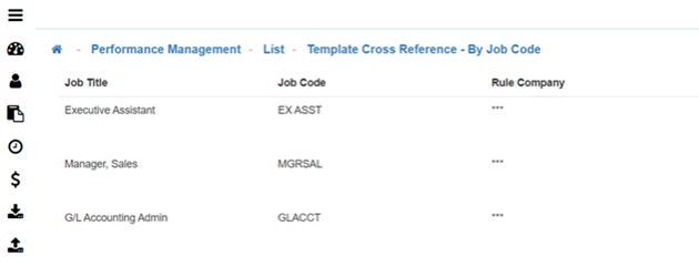 The Template Cross Reference - By Job Code screen populates a list of the 'Template(s)' that are attached to a specific Job Code. This list will show up empty if you have no 'Templates by Job Code'.