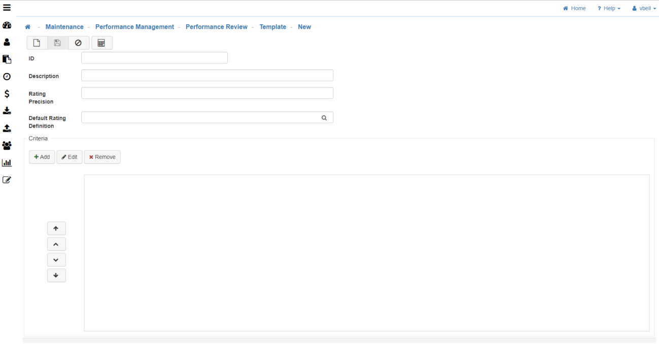 The Template Maintenance is where you create Templates which will contain the criteria items that an Employee is going to be rated on. The Template is used to create the competencies that an Employee is going to be rated upon during the Appraisal process.