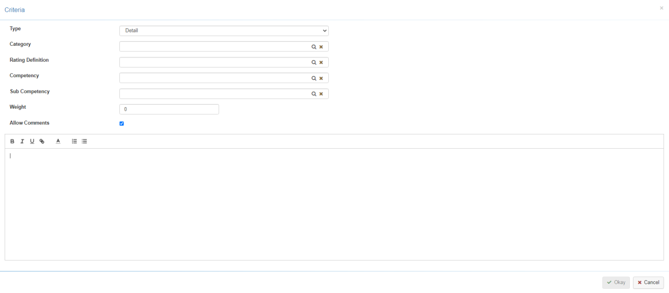 Select a Competency for each Criteria, if you wish to have the Phrase Selector available when writing comments about an Employee in the evaluation form for a specific Criteria/Question. If the Phrase Selector is not being used, tagging a Competency to specific Criteria still has value as it will build more meaningful reports and provide additional data for analysis. -
