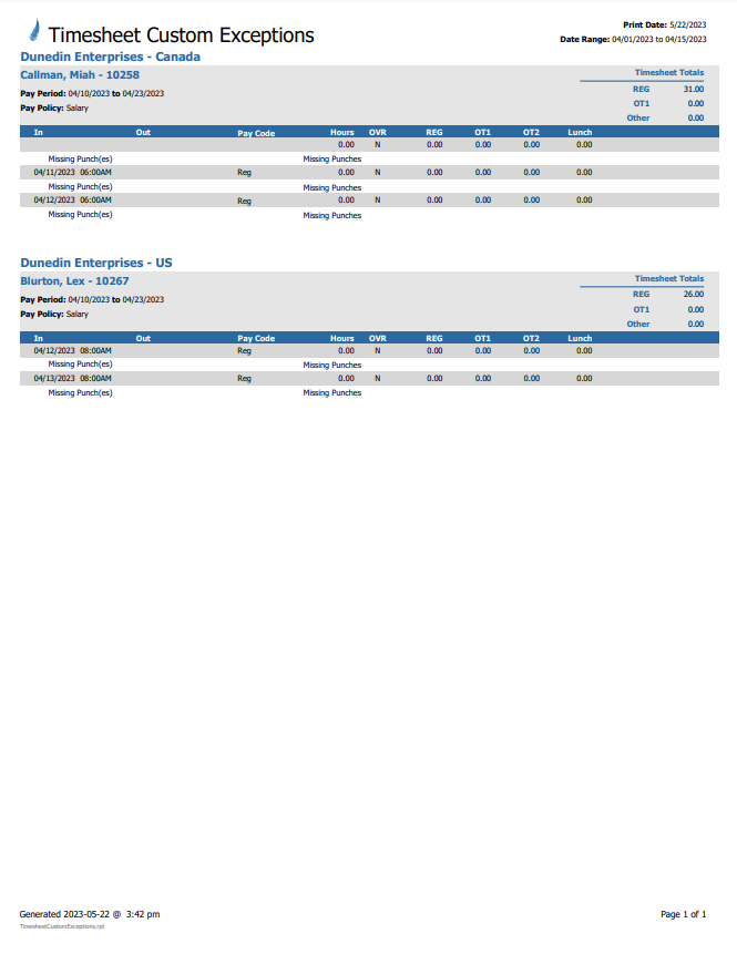 The Timesheet Custom Exceptions report allows greater visibility into timesheets where custom exceptions are present.