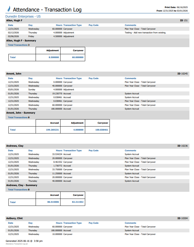 The Transaction Log report provides a list of transactions. Details include the Employee Name, Date(s), Day, Hours, Transaction Type, Pay Code, Comments, and Company.