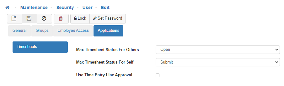 In the example configuration above, this User would be unable to approve any Timesheets they have access to but would have the ability to submit their own Timesheet.