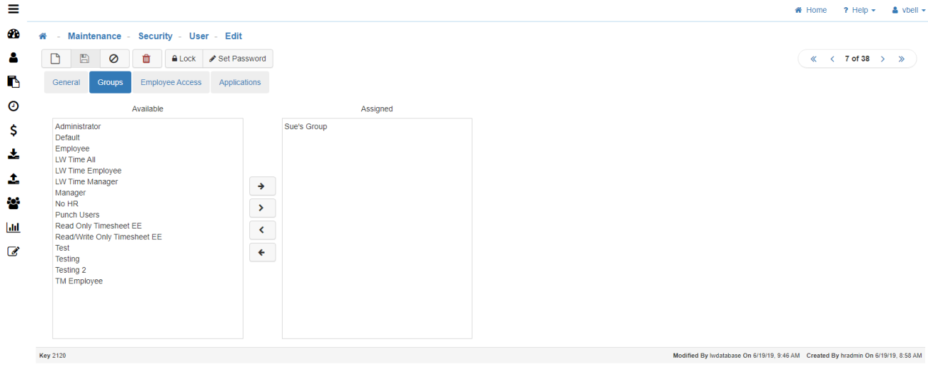 Assign the appropriate Group(s) to the User by choose the Group(s) from the available column and use the arrows to move the Group(s) to the assigned column.